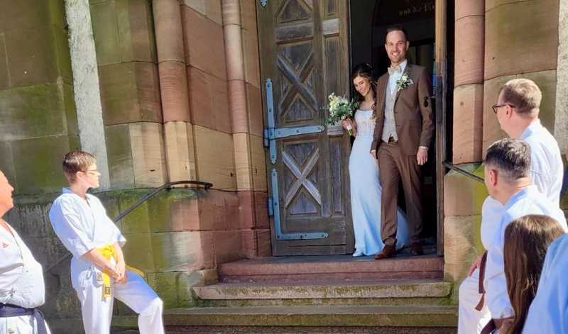 Wir vom Karate-Do Lahr haben es uns natürlich nicht nehmen lassen, die beiden nach der kirchlichen Trauung zu überraschen und nach guter alter Karatetradition zu empfangen.