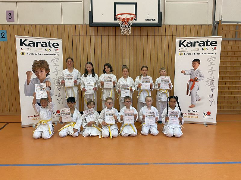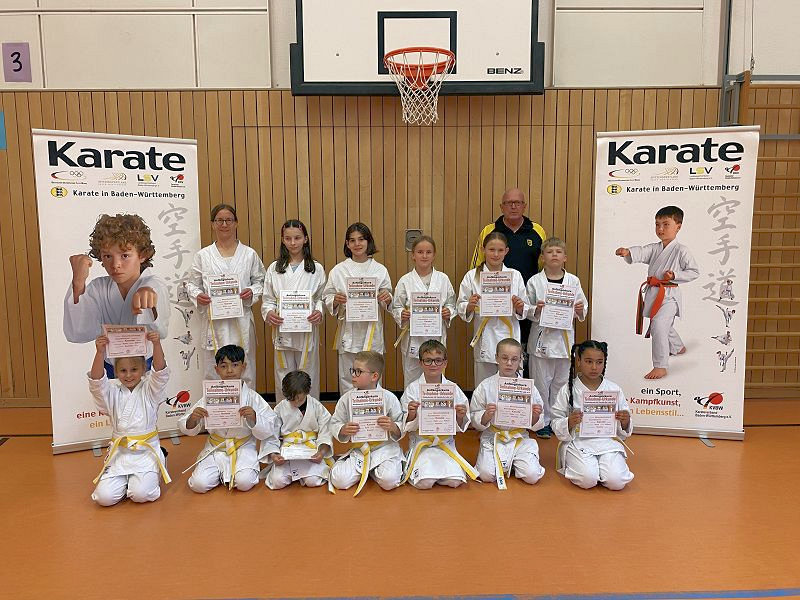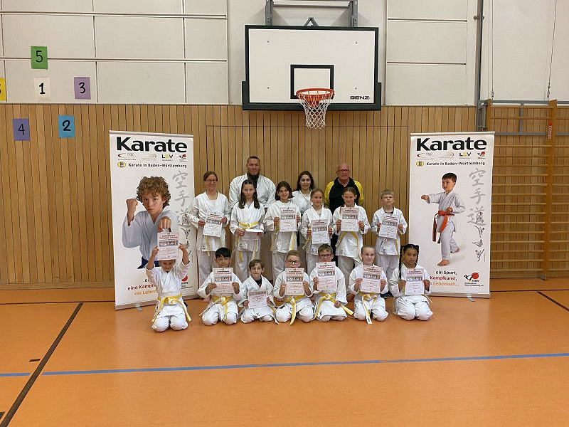 Zum Abschluss des Anfängerkurses legten 12 Kinder und eine Mutter ihre erste Gürtelprüfung zum Weiss-Gelbgurt nach den Rahmenbedingen Multi-Mediales Kinderkarate nach den Vorgaben des Deutschen Karate Verbandes e.V. ab.