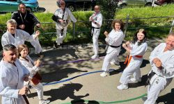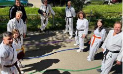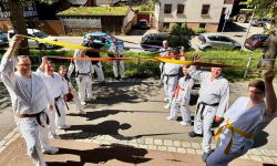 Zuerst gab es ein paar Partnertechniken zu bestaunen und danach durfte das Brautpaar, als Zeichen für ewiges Glück in der Ehe, unter den Karategürteln hindurch gehen.